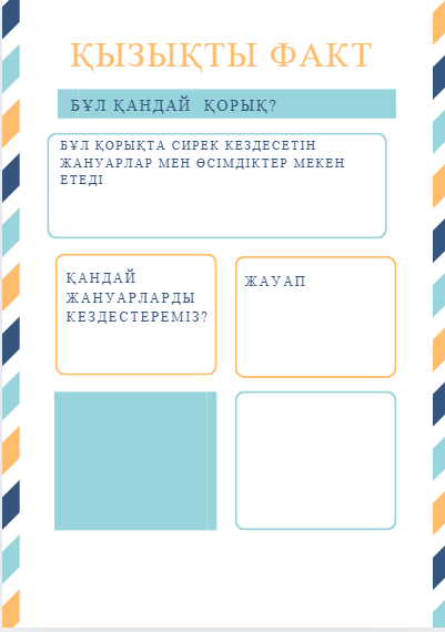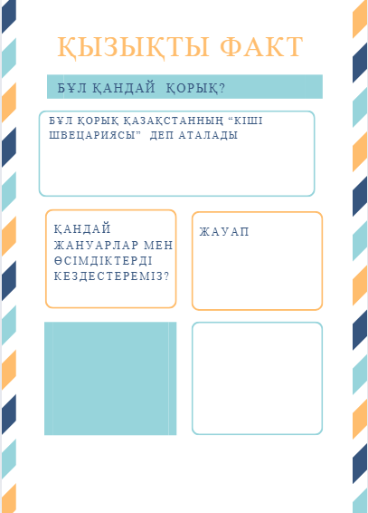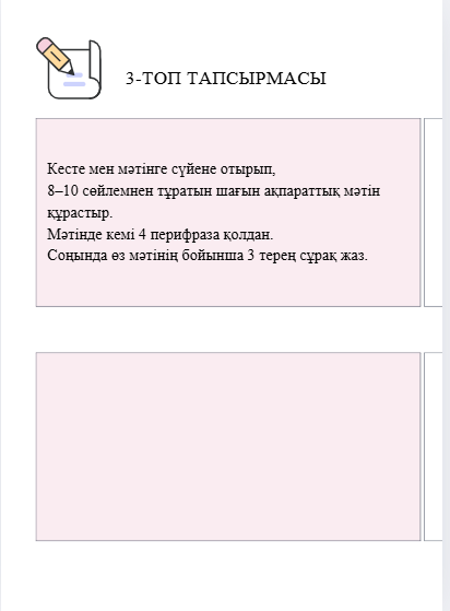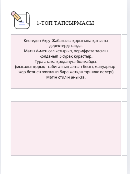 2) Сұрақтарға жауап беріңдер 1. Жергілікті жердің табиғи қалпын сақтап қалу үшін қорықтар ашудан басқа не істеуге болады? 2. Жануарлардың бейнесіне ұқсастырып аталған тағы қандай жер-су аттарын білесіңдер? 1-топ:Тапсырма Кестеден Ақсу-Жабағылы қорығына қатысты деректерді таңда. Мәтін А-мен салыстырып, перифраза тәсілін қолданып 5 сұрақ құрастыр. Тура атама қолдануға болмайды. (мысалы: қорық- табиғаттың алтын бесігі, жануарлар-жер бетінен жоғалып бара жатқан тіршілік иелері) Мәтін стилін анықта. 2-топ: Тапсырма Екі мәтінді оқып, ортақ 3 негізгі ойды анықта. Әр ойға перифраза қолданып сұрақ құрастыр (кемі 6 сұрақ). Сұрақтар арқылы мәтін стилінің белгілерін көрсет. 3-топ:Тапсырма Кесте мен мәтінге сүйене отырып, 8–10 сөйлемнен тұратын шағын ақпараттық мәтін құрастыр. Мәтінде кемі 4 перифраза қолдан. Соңында өз мәтінің бойынша 3 терең сұрақ жаз. Саралау Кей оқушыға бір мәтінмен ғана жұмыс істеуге рұқсат Алдын ала тірек сөздер беріледі Құндылық Экологиялық сана Сыни ойлау Жауапкершілік Табиғатқа жанашырлық ЕББҚ 5–6 сөйлем жеткілікті Перифраза саны — 2 Ауызша баяндауға болады ӘТН