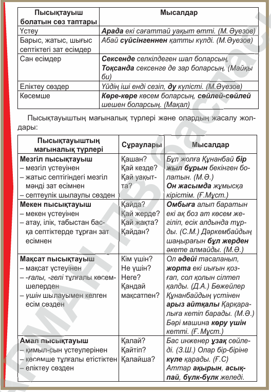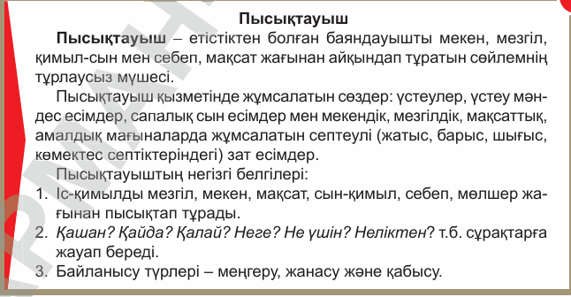 Дескриптор 1 -кестеден маңызды 2–3 деректі анықтайды -кемі 5 перифразалы сұрақ құрастырады -мәтіннің публицистикалық стильде екенін дәлелдейді 3балл Дескриптор 2 -екі мәтіннен ортақ ойды табады -6 перифразалы сұрақ құрастырады -стиль белгілерін (ақпараттылық, нақтылық, қоғамдық мән) атайды 3балл Дескриптор 3 -8–10 сөйлем құрайды -4 перифразаны орынды қолданады -мазмұнды сұрақтар құрастырады 3балл Дескриптор -пысықтауыштың кемінде 5 мағыналық түріне сөйлем құрастырады; -пысықтауыштың қай сөз табынан жасалғанын анықтайды; -тұрлаулы және тұрлаусыз мүшелерді дұрыс белгілейді; -пысықтауыштың мағыналық түрін дәл көрсетеді. 4балл Дескриптор -тақырыпқа сай жинақы мәтін жазады; -табиғат көрінісін нақты сипаттайды; -мәтін құрылымын сақтайды; -сөз санын (60–70) сақтайды; -тілдік нормаларды дұрыс қолданады. 3балл |