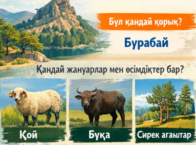 Саралау Тірек сөздер ұсынылады: таулы өлке, өзен аңғары, алуан түрлі өсімдік, сирек жануарлар, табиғи байлық Құндылық Табиғатты аялау Экологиялық жауапкершілік Ұлттық мұраны қадірлеу ЕББҚ Мәтін көлемі: 40–50 сөз Дайын сөйлем бастамалары беріледі: Ақсу-Жабағылы қорығы — … Бұл жерде … өсімдіктер мен … жануарлар мекендейді. Ауызша сипаттап беруге рұқсат етіледі |