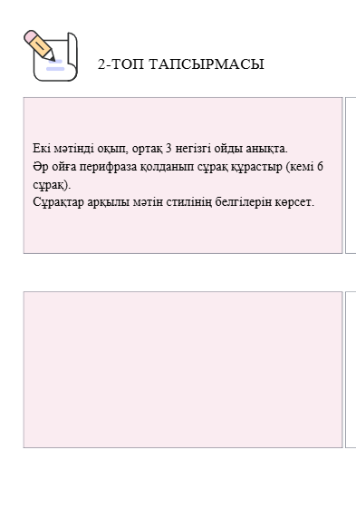 Топтық жұмыс 1-тапсырма. 1)Екі мәтінмен танысыңдар. Кестедегі ақпараттың маңызды тұстарын анықтап, кемі 8–10 сөйлем құраңдар. Мәтіндердің стилін анықтаңдар.
