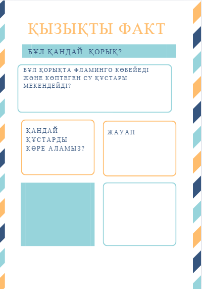 Ұйымдастыру кезеңі Амандасу. Сынып оқушыларын түгендеу. Оқушылар назарын сабаққа аудару. Үй жұмысын сұрау,пікір білдіру. Жағымды психологиялық ахуал Қызығушылықты ояту. “Қорықтарды таны” ойыны Қорық туралы қызықты факт жазылған карточкаларды тарату/оқу