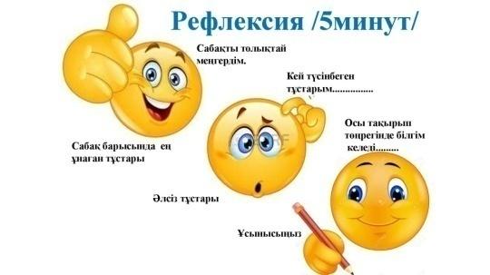 Оқушылар бүгін сабақ барысында ең ұнаған тұстарын, сабақты қаншалықы меңгергендігін, рефлексия жасайды.