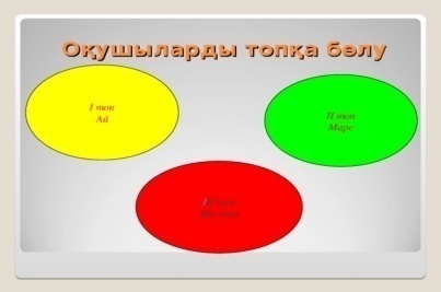 Ұйымдастыру кезеңі: Оқушылармен сәлемдесу. Түгендеу. Оқушылар таңдаған түстер арқылы үш топқа бірігеді «Зымран сұрақтар» әдісі арқылы өткен тақырыпты сұрақтар қою арқылы пысықтап аламын.