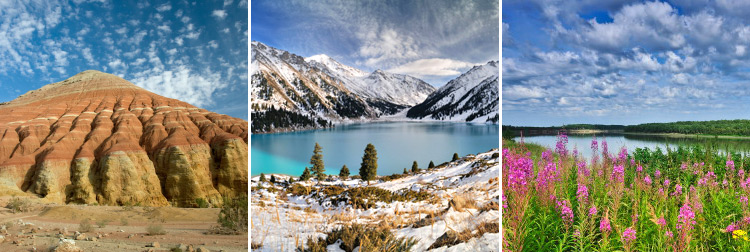 Жер бедерінде әр текті жазықтар мен әртүрлі биіктікті таулардың кездесуіне, климаттың континенттілігіне байланысты Қазақстан ландшафттарының өзіндік сипаты анықталады.