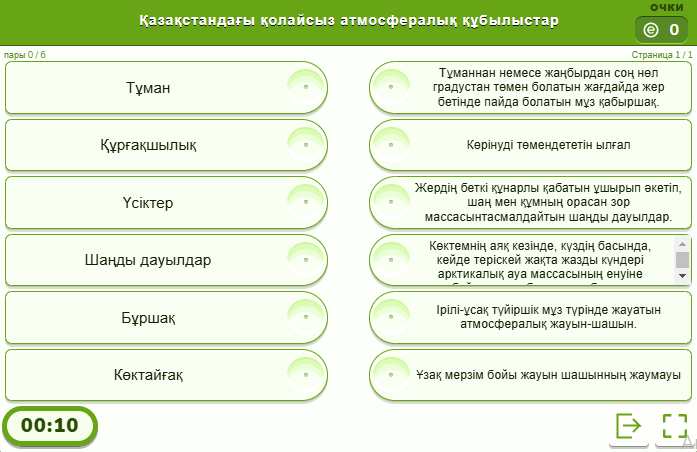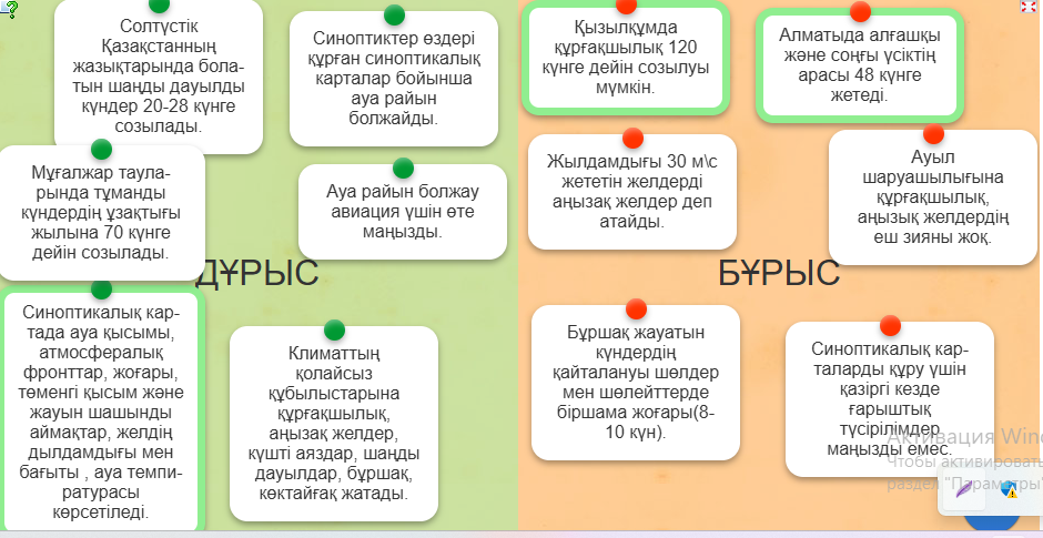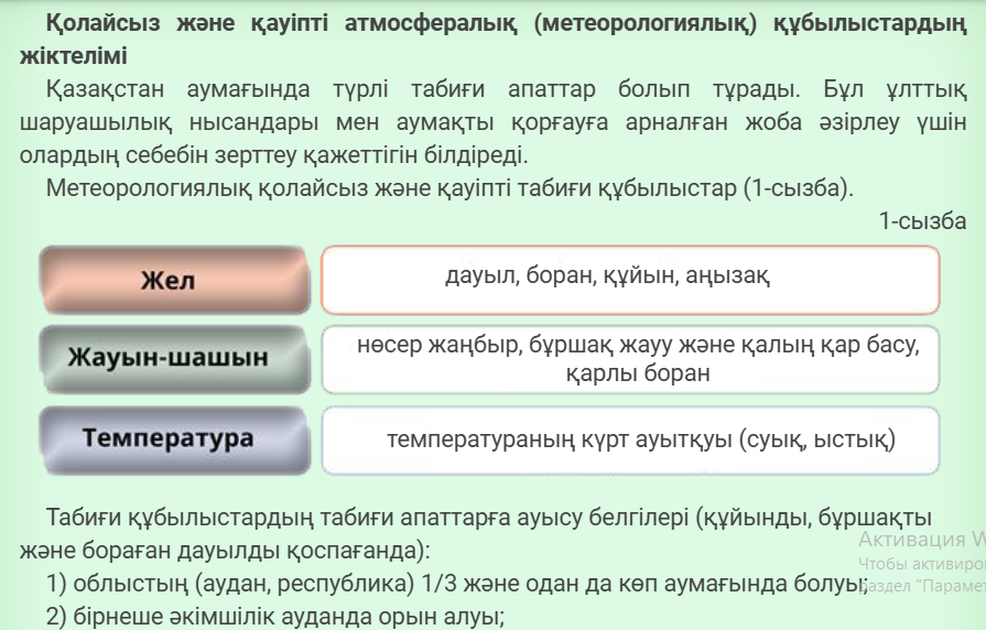 Арнайы ресурстар арқылы жаңа тақырыпты талдайды Жеке, өзара тақырыпты түсінгендерін мұғалімге қол көтеру арқылы білдіреді Слайдта көрсетілген ресурстарды талқылайды Видеороликтан тақырыпқа сай берілген түсініктерді дамыту арқылы, мәтіндегі тапсырмаларды орындау барысында ой өрісін жетілдіру арқылы бәсекелеседі Оқушылар Қазақстандағы қолайсыз атмосфералық құбылыстарды сәйкестендіреді.