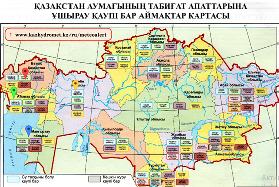 9.3.2.4 Қазақстанда атмосфералық қолайсыз және қауіпті құбылыстардың қалыптасуын, таралу аумақтарын картада көрсетіп, сақтану шараларын ұсынады 9.2.1.1 маңызды географиялық нысандарды, үдерістер мен құбылыстарды карталардан көрсету барысында сипаттайды |