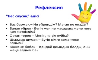 Бүгінгі сабақтан түйген ойлары мен тұжырымдарына байланысты рефлексия жасайды. |