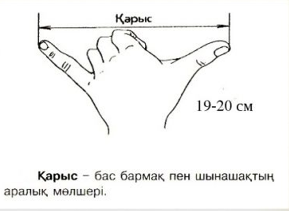 Қазақтың байырғы өлшемдерімен таныстыру (видео көрсетемін) Қарыс сүйем – бас бармақ пен ортан саусақтың аралық мөлшері. 1 қарыс сүйем ≈ 20 – 22 см