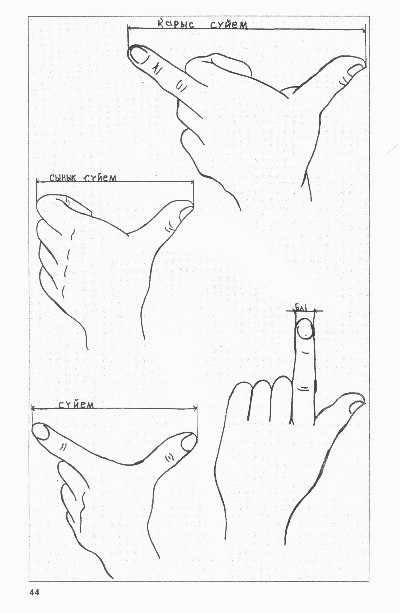 Сүйем – бас бармақ пен сұқ саусақты керген кездегі ұзындық. 1 сүйем ≈ 17 - 18 см