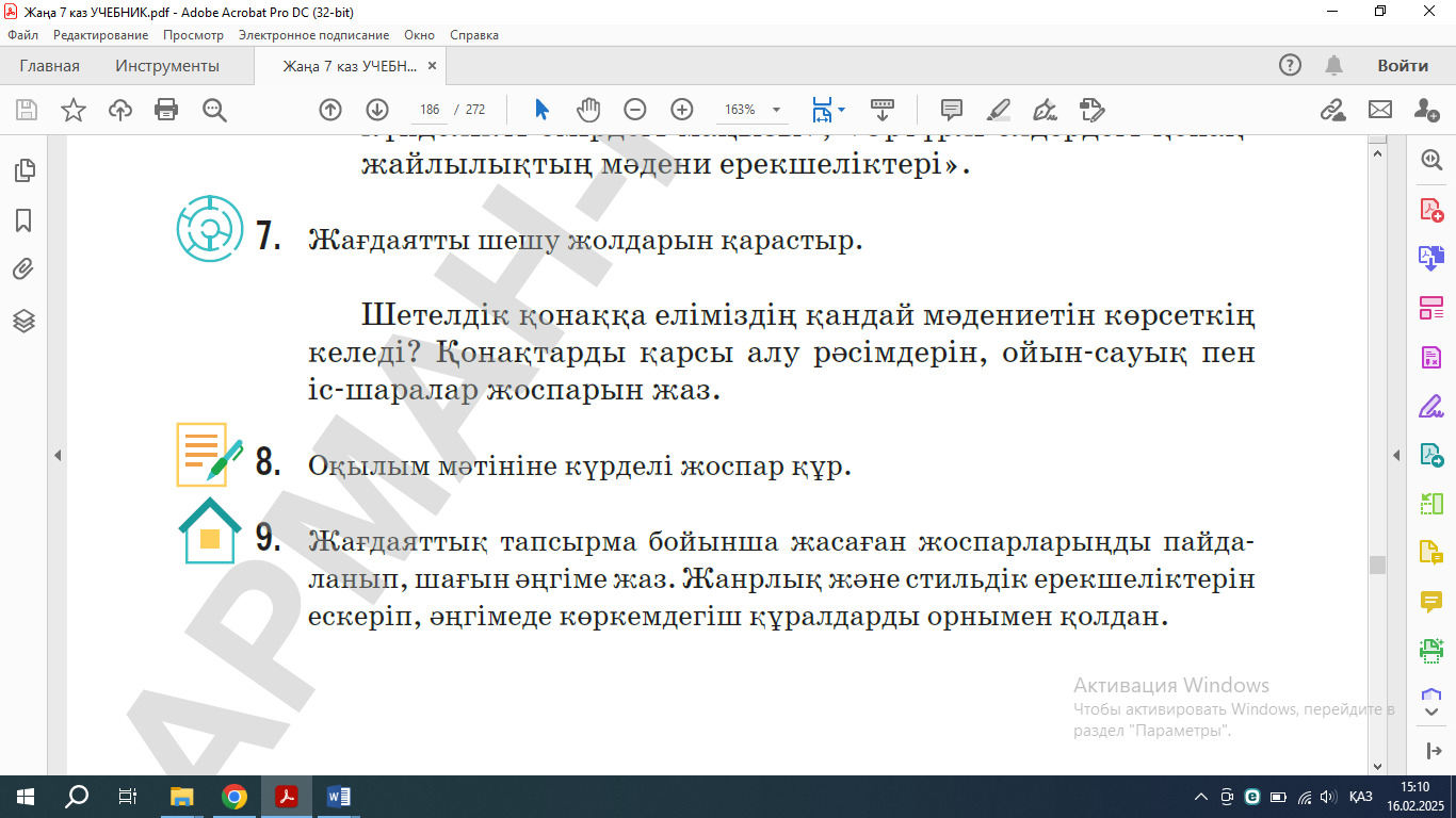 Білім алушылар тыңдалым мәтіні бойынша сұрақтарға жауап береді. Білім алушылар ойында берілген сұрақтарға жауап береді. Топтық жұмыс атқару барысында,білім алушылар мәтінді оқып,тапсырма орындайды. Білім алушылар шетелдік қонақты қарсы алу рәсімдерін, ойын-сауық пен іс-шаралар жоспарын жазады. |
