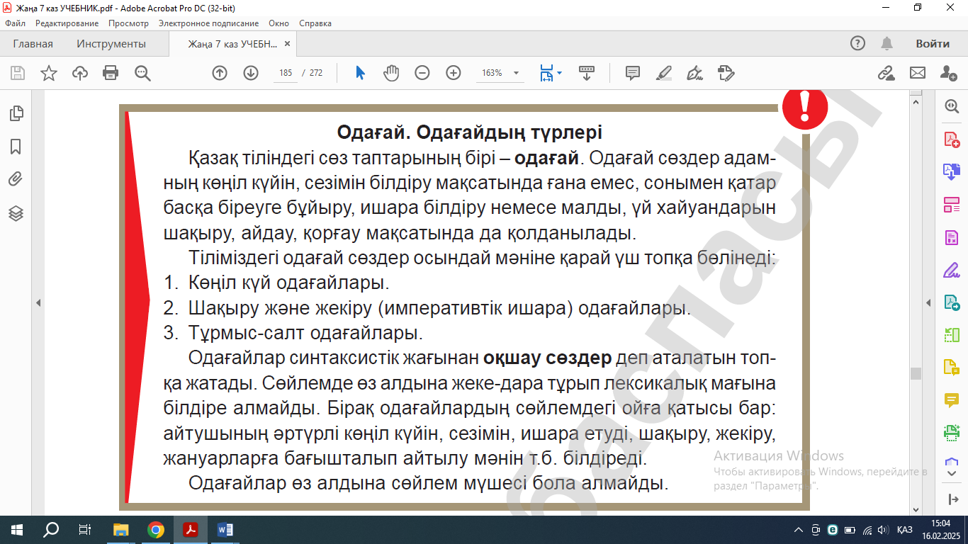 7.1.3.1 Тыңдалған мәтіннің мазмұнын түсіну, ұсынылған ақпарат бойынша факті мен көзқарасты ажырата білу; 7.4.4.4. Одағай түрлерін ажырата білу , орынды қолдану. |