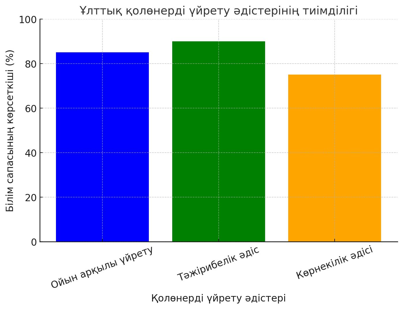 Қазақ халқының қолөнері – ұлттық мәдениетіміздің ажырамас бөлігі. Бұл өнер түрі ғасырлар бойы қалыптасып, ұрпақтан-ұрпаққа мирас болып келе жатқан рухани және материалдық құндылықтардың бірі болып табылады. Алайда жаһандану заманында ұлттық қолөнердің маңызы бәсеңдеп, оның күнделікті өмірде қолданылуы азайып барады. Осыған байланысты, қазақтың дәстүрлі қолөнерін балабақшадан бастап балаларға үйрету – ұлттық мәдениетті сақтап қалудың және оны болашақ ұрпаққа жеткізудің ең тиімді жолдарының бірі. Бұл зерттеуде қазақтың ұлттық қолөнерін үйретудің әдістері мен олардың тиімділігі жан-жақты қарастырылды. Зерттеу барысында ойын арқылы үйрету, тәжірибелік жұмыс және көрнекілік әдістерін қолдану ең тиімді тәсілдер ретінде анықталды. Әсіресе, тәжірибелік жұмыс жасау әдісі балалардың ұлттық өнерге деген қызығушылығын арттыруда, олардың шығармашылық қабілеттерін дамытуда, еңбекке баулу мен ұқыптылықты қалыптастыруда жоғары нәтижелер көрсетті. Ұлттық қолөнерді үйретуде ойын әдісі балалардың қызығушылығын арттыруда ерекше рөл атқарады. Балалар ойын барысында ақпаратты жеңіл қабылдайды, тапсырмаларды қызығушылықпен орындайды және өзара қарым-қатынас дағдыларын дамытады. Зерттеу нәтижелері бойынша, ойын әдісінің білім сапасына әсер ету көрсеткіші 85% болып, оның жоғары тиімділігін көрсетті. Тәжірибелік әдіс – ұлттық қолөнерді үйретудің ең нәтижелі әдістерінің бірі. Балалар өз қолдарымен ұлттық бұйымдар жасаған кезде олардың эстетикалық талғамы, ұсақ моторикасы дамиды, шығармашылық қабілеті артады. Сонымен қатар, олар еңбектің қадірін түсініп, ұқыптылыққа, жауапкершілікке үйренеді. Тәжірибелік әдістің тиімділік көрсеткіші 90%-ды құрады, бұл оның балалардың білім сапасын арттырудағы жоғары нәтижелілігін дәлелдейді. Көрнекілік әдісі балаларға қазақтың ұлттық қолөнері туралы нақты ақпарат беруде маңызды рөл атқарады. Дайын бұйымдарды көрсету, бейнероликтер көру, ою-өрнектердің мағыналарын түсіндіру арқылы балалардың көзбен көру арқылы танымдық деңгейін арттыруға болады. Бұл әдіс ақпаратты есте сақтау қабілетін күшейтеді. Көрнекілік әдісінің тиімділік көрсеткіші 75% болып, ойын және тәжірибелік әдістерге қарағанда төмендеу нәтиже көрсетті. Бұл әдісті басқа әдістермен бірге қолданғанда ғана оның әсері арта түсетіні байқалды. Жалпы, ұлттық қолөнерді үйретудің тиімділігі баланың жас ерекшелігіне сай әдістерді дұрыс таңдауға байланысты. Қазақтың қолөнерін үйретудің ең нәтижелі жолы – ойын әдісі мен тәжірибелік әдісті қатар қолдану. Балалар қолөнерге байланысты ойындар арқылы жаңа нәрсені тез қабылдайды, ал тәжірибелік жұмыстарды орындау арқылы алған білімдерін іс жүзінде қолданып, шығармашылық қабілеттерін дамытады.