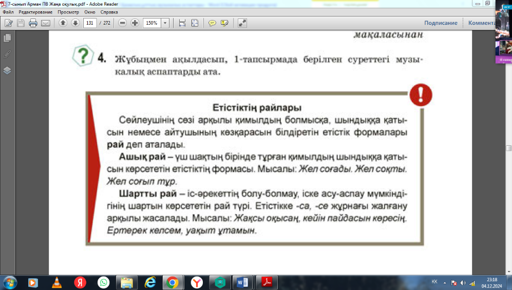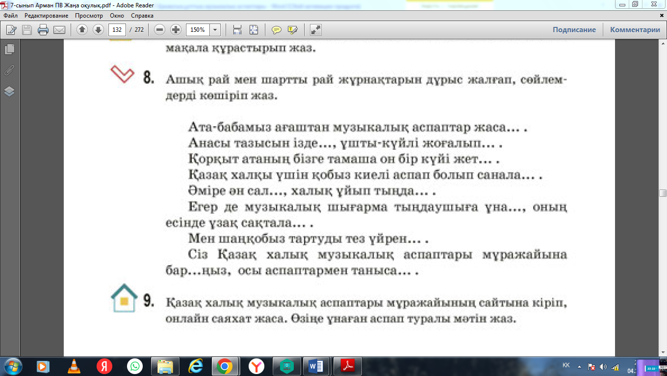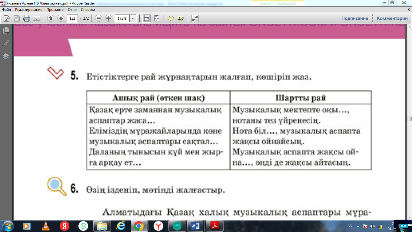 7.2.5.1 мәтін бойынша проблемалық сұрақтар құрастыру 7.4.4.1 Етістіктің шақ, рай түрлерін тілдесім барысында қолдану. |