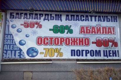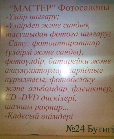 Хабарландыру немесе жарнама жазу кезінде қазақша сауаты аз адамдар сөздерге тікелей аударма жасап бұрыштамаларға еш тексертусіз ілінетіні анық. Бұрыштамаларды талдап көрейік.