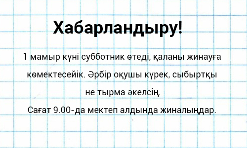 Мектеп әкімшілігіндегі мұғалімдерінен туындаған хабарландыру. Біріншіден сөздер қазақша мәтінде құрастырылмаған. Екіншіден қазақ тіліне тиісті әріптердің орындары ауысып кеткен.