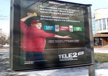 Көптеген аялдамаларда ілініп тұрған мына жарнамаға көзіңіздің еріксіз түсері анық. Tele2 ұялы байланысы көшеге «Зачем докупать? Можно просто обменять» – «Қосымша сатып алудың қажеті не? Жай ғана ауыстыруға болады» деген жарнама ілген. «Докупать» деген сөз қазақша-орысша сөздікте «қосымша сатып алу» деп аударылған. Байланыс компаниясы да сыртқы жарнамаға осы сөзбе-сөз нұсқаны қолданып отыр. Оны «артық сатып алып не керек», «көп сатып алып не керек» деп аударуға болар еді. Оның үстіне, жоба өкілдерінің пікірінше, «қосымша» сөзі көбіне орыс тіліндегі «приложение» сөзінің аудармасы ретінде қолданылады.