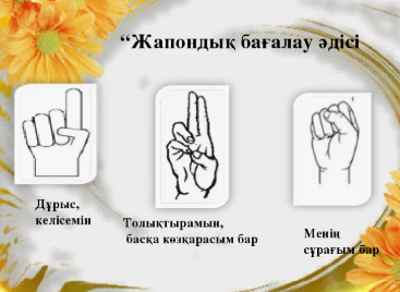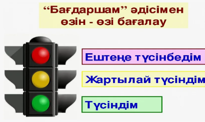 Рефлексия және өзін-өзі бағалау әдісі: Оқушы өз жетістігін бағалап, өз жұмысын талдайды. Қателерді анықтап, түзету жолдарын меңгереді.