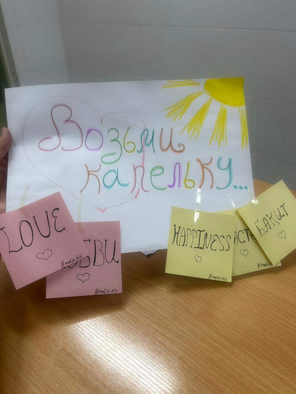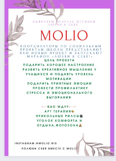 Ең бірінші кезекте, жаңа ұжымдасқан топ мүшелері мектеп кітапханасынан «Кради, как художник» атты кітапты алып оқыды. Екінші кезекте, акцияның жоспарын құру, атын қойып, логотип жасау болды. Бұл акция оқушылардың шешімі бойынша, ақпан айын өз өзіне қамқорлық айы деп атады. Мектептегі барлық адамдар үшін жағымды, позитивті орта құруды мақсат еткен, кішігірім қауымдастық қалыптасты. Олар өздерін және осы айды MOLIO деп атап, инста парақшасын ашты.