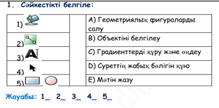 Бағалау критерийі: Әр дұрыс жауапқа 1-балл Бағалау критерийі: 1- D дұрыс ; 1-балл 2- C дұрыс; 1-балл 3-E дұрыс; 1-балл 4- B дұрыс:1-балл 5-A дұрыс; 1-балл Бағалау критерийі: --Photo-brush-қа музейдің суретін орналастырады; 1-балл - жарқыл береді; 1-балл -кривые RGB мен өзгеріс жасайды; 1-балл