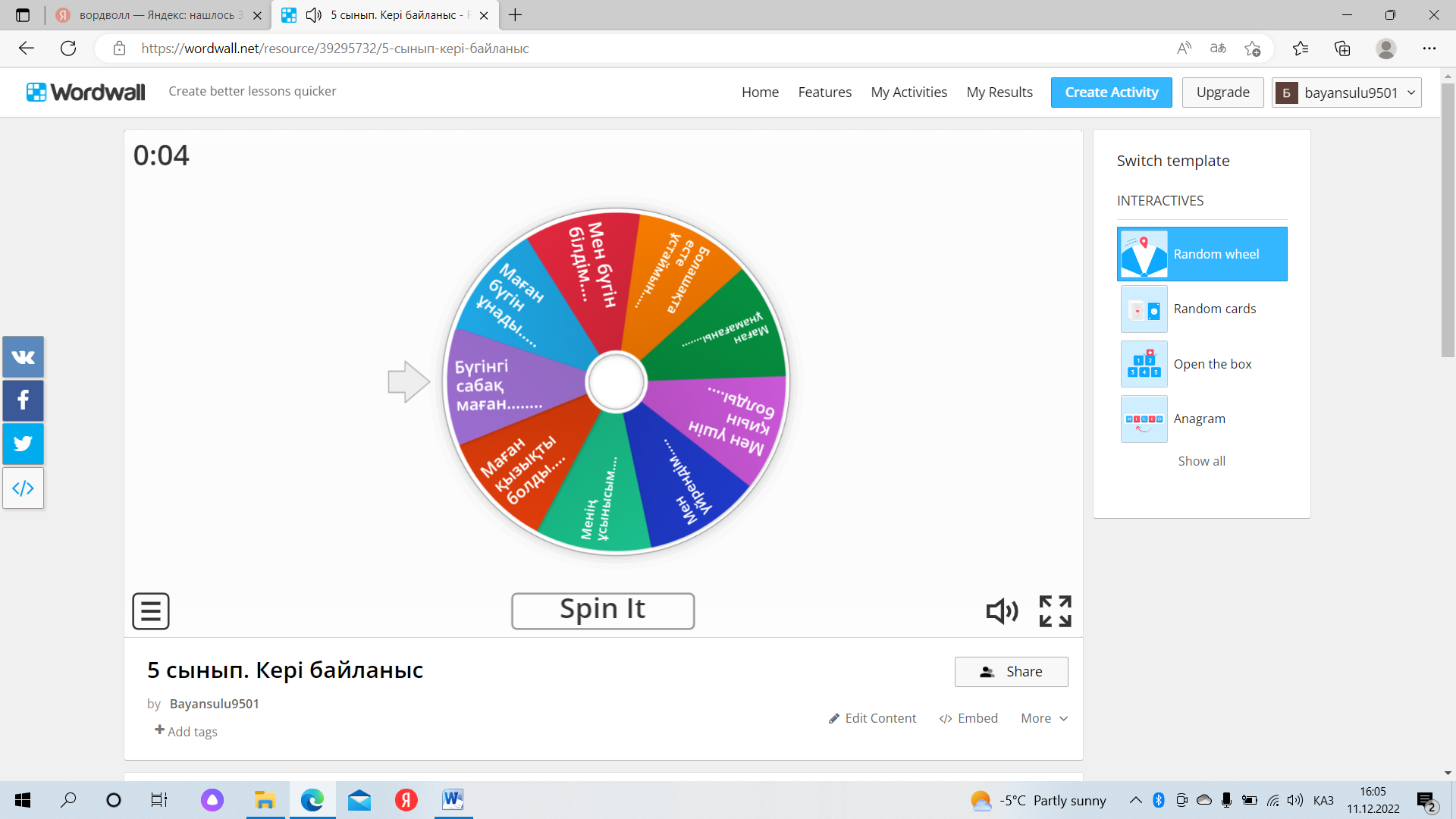 Дискідегі тапсырмалар Wordwall қосымшасы «Кездейсоқ дөңгелек» әдісі |