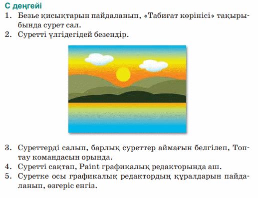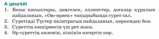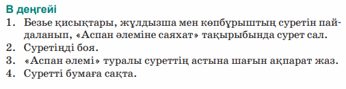 Жұптық жұмыс 2- тапсырма «Көршіңмен талқыла» әдісі арқылы суретті салады. Қандай құралдар пайдаланғанын жұбымен талқылайды. Керекті мәліметті дәптерге жазады
