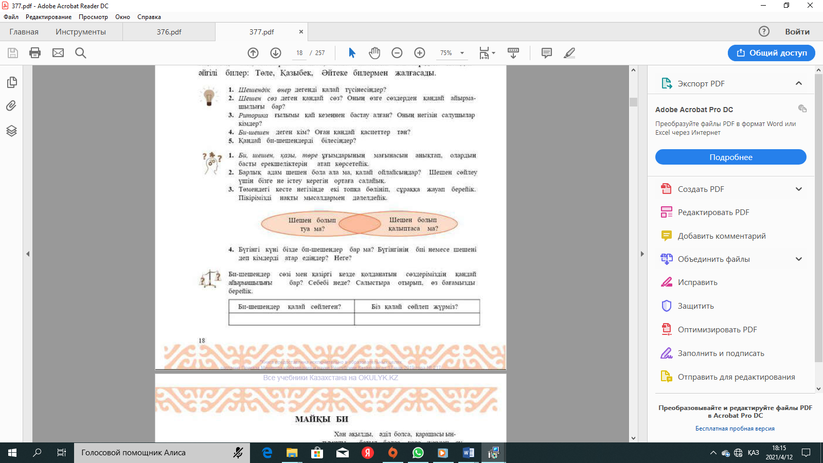 1.»Ердің бақыты-«әйел» деген әңгімесінде не туралы айтылған? 2.Төле бидің шешендік өнері туралы не ойлайсыздар? |