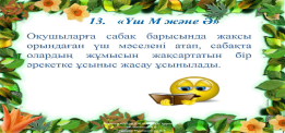 Барлық оқушылар істей алады: Оқулықта берілген және қосымша тапсырмаларды орындайды. Жазба жұмыс жасайды. Сұраққа жауап береді. Көптеген оқуышылар істей алады: Топтық жұмысты брлесе орындайды.Өз бетінше жұмыс жасайды. Сұраққа жауап береді. Қосымша үлестірме ресурстармен жұмыс жасайды. Кейбір оқушылар істей алады: Оқулықтан тыс берілген қосымша тапсырмалады орындайды, тақырып бойынша қосымша мәліметтер мен дәлелдер келтіре алады. |