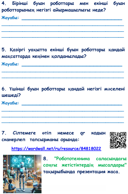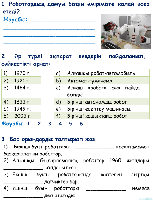 - Қазіргі роботтар туралы не айта аласыңдар? - Адам мен роботтың басты айырмашылығы неде деп ойлайсыңдар? Сабақтың тақырыбы мен мақсаты анықталады. |