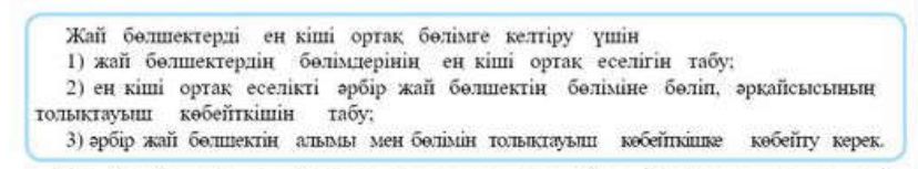-Көңіл-күйің қалай? -Сабаққа деген көңіл-күйің жақсы болса, жаңа тақырыпты бастайық. Бүгін біз сабақта жай бөлшектерді ортақ бөлімге келтіру; жай бөлшектерді, аралас сандарды салыстырып үйренеміз. Есіңде сақта!