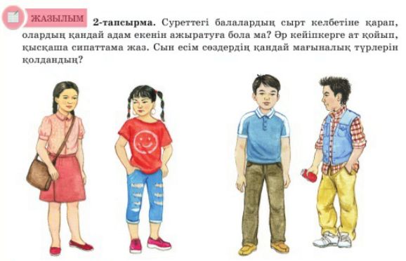 1-тапсырма Қайталау жаттығуы Тіл ұстарту жаттығуы Ыр-ыр-ыр ырылдайды қасқыр, Кі-кі-кі бұлғаңдайды түлкі. Ян-ян-ян секіріп жүр қоян, Ю-ю-ю қорбаңдайды аю. Бүгінгі сабақта коммуникативтік жағдаятқа сай эмоционалды сөздерді, дауыс ырғақтары арқылы қыстырма, қаратпа, одағай сөздерді еркін қолданып, диалогке даярлықсыз қатысып, өз пікірін білдіруді үйренеміз. 1 тапсырма Ойбөліс 1.Адамның сыртқы келбеті дегенді қалай түсінесіңдер? 2.Сыптқы келбет пен адамның ішкі дүниесінің байланысы бар ма? 2-тапсырма |