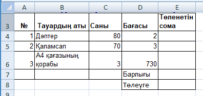Анықта: а. Кем дегенде 1 тауардың құнын есептейтін формуланы анықта b. Барлық тауар үшін төленуге тиіс соманы анықта с. Соңғы жалпы бағаның құнына қарай (2500 теңгеден көп пе) жеңілдік жасауға болатыны/болмайтыны туралы шешімді алатын формуланы анықта.Егер жеңілдік болатын болса, оның мөлшері 5%.