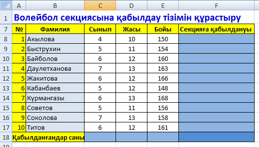 Кестеге талдау жаса. Соңғы нәиже бойынша неше оқушы секцияға қабылданады а. Кез-келген бір оқушының секцияға қабылдануы немесе қабылданбауы туралы ақпараты шығаратын формуланы құрастыр. b. Барлық қабылданған оқушылардың санын анықтайтын формуланы құрастыр.