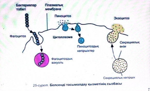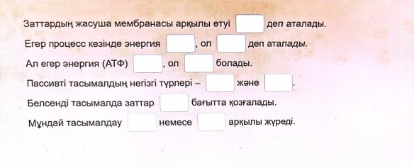 Нұсқау береді: 1) Суретке қарап, заттардың мембрана арқылы қалай өтетінін анықта; 2) Әр бағыттағы қозғалысты белгіле; 3) Белсенді және пассивті тасымал айырмашылығын қысқаша жаз; 4) Қайсысында энергия жұмсалады? Тапсырма соңында 2–3 жұптың жауабын сыныпта талқылайды Құндылықтармен байланыс: