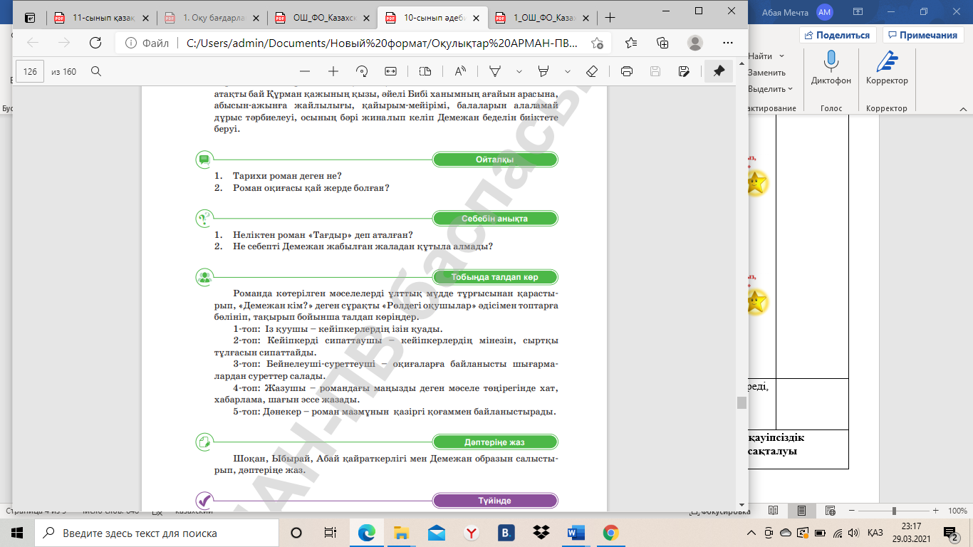 Роман мазмұны. «Джигсо» әдісімен оқушылар роман мазмұнымен танысады. 1-тапсырма. Оқушылар романның негізгі идеясын, мақсатын анықтап, сюжеттік-композициялық құрылысын талдайды.