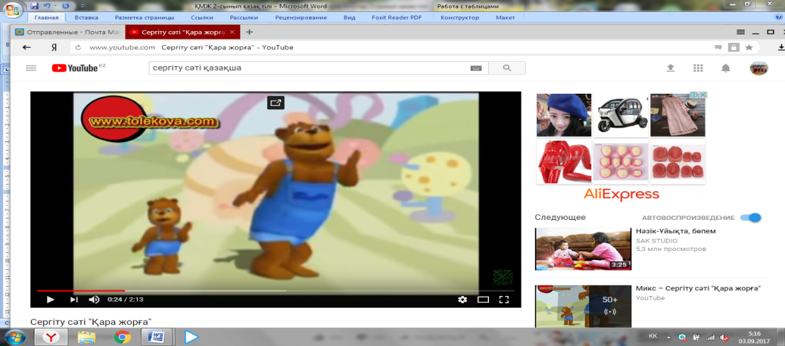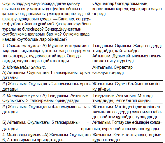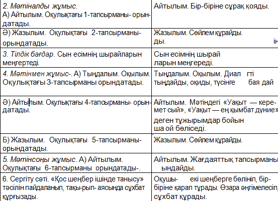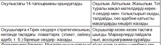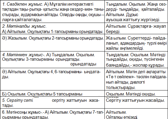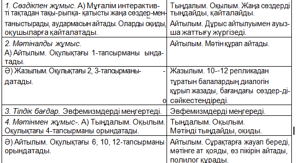 Оқылым алды тапсырма.1. Сөздікпен жұмыс. А) Мұғалім интерактивті тақтадан тақырыпқа қатысты жаңа сөздермен таныстырады,аудармасын айтады. Оларды оқиды, оқушыларға қайталатады. 1.Сөздікпен жұмыс.А)Мұғалім интерактивті тақтадан тақырыпқа қатысты жаңа сөз -дермен таныстырады,аудармасын айтады. Оларды оқиды,оқушыларғақайталатады. 2. Мәтіналды жұмыс.А) Тыңдалым.Оқылым.Айтылым.Оқулықтағы 1-тапсырманы орындатады.Ә) Оқылым. Жазылым. Оқулықтағы 2-тапсырманы орындатады. 3.Тілдік бағдар Көмекші есімдерді меңге теді.А)Жазылым.Оқулықтағы3,4-тапсырманы Ә) Айтылым. Оқулықтағы 5 тапсырманыорындатады.«Кім жылдам?» ойынын ұйымдастырады, жұптық жұмысорындатады. 4. Мәтінм н жұмыс. А) Оқылым. Айтылым.Оқулықтағы 6-тапсырманы орындатады.Ә) Айтылым. Оқулықтағы 7, 8-тапсырманы орындатады. Б) Жазылым. Оқулықтағы 9-тапсырманы орындатады. 5. Мәтінсоңы жұмыс. А) Тыңдалым. Оқулықтағы 10-тапсырманы орындатады.Ә) Жазылым. Оқулықтағы 11 -тапсырманы орындатады СЖ. «Сөздікпен жұмыс» әдісі.Сөздерді мағынасына қарай сәйкестендір.