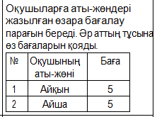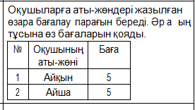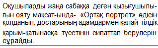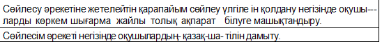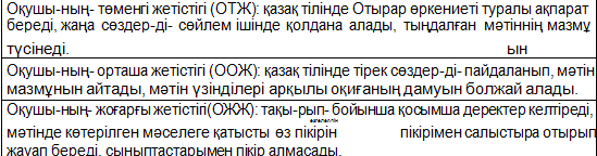 Барлық оқушылар орындай алады:Барлық оқушы мақал-мәтелдер, терминдер мен неологизмдерді ажырата алады. Көпшілігі орындай алады:Мәтін құрап айтуда мақал-мәтелдер, терминдер мен неологизмдерді орынды қолдана алады. Кейбір оқушылар орындай алады:Мәтін мазмұнын дамытып айтады. |