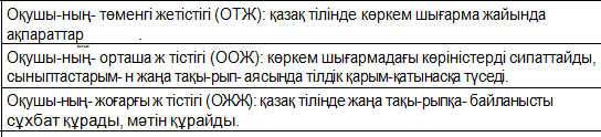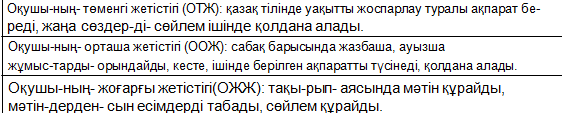 Оқушының төменгі жетістігі (ОТЖ): қазақ тілінде ғылыми жоба туралы ақпарат береді,жаңа сөздерді сөйлем ішінде қолдана алады. Оқушының орташа жетістігі (ООЖ): сабақ барысында жазбаша, ауызша жұмыстардыорындайды, кесте, ішінде берілген ақпаратты түсінеді, қолдана алады. Оқушының жоғарғы жетістігі(ОЖЖ): тақырып аясында мәтін құрайды, мәтіндерден көмекші есімдерді ажырата біледі, полилог құрады. |