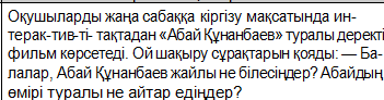 7.Т2. Тыңдалған мәтіннің негізгі мазмұнын түсіну, ақпараттың өзектілігін анықтау. 7.ТБ1 Мәтіндерден көмекші есімдерді ажырата білу, жазбаша, ауызша жұмыстарда қолдану. |