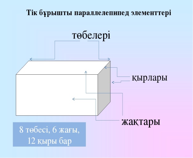 10.3.7 - тікбұрышты параллелепипедтің қасиеттерін қорытып шығару және есептер шығаруда қолдану; |