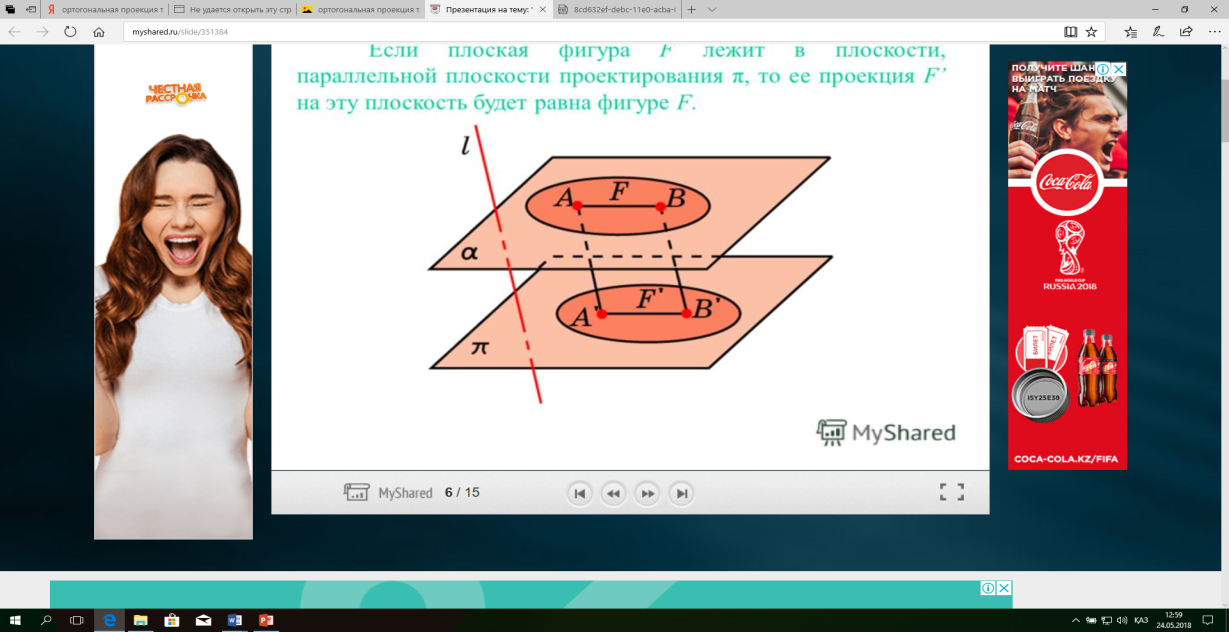 Жаңа материалмен танысу: Проекциялау деп жазықтықта (қағазда, экранда, дәптерде) нәрсенің кескінін салу процесін айтады. Бұл жағдайда алынған кескінді проекция дейміз «Проекция» дегеніміз латын сөзі, «алдыға лақтыру» деген мағынаны білдіреді Электр шамының алдында қандай да бір затты орналастырайық сонда оның қабырғада пайда болған көлеңкесін нәрсенің проекциясы деп айтуға болады. Кеңістіктік фигураларды жазықтыққа кескіндеу үшін параллель проекциялауды пайдаланады. Фигураны кескіндеудің осы тәсілі: Кеңістікте F фигурасы мен α жазықтығы берілсін, α жазықтығын қиятын l түзуін аламыз. F фигурасының әрбір нүктесінен l түзуіне параллель түзулер жүргіземіз. Бұл түзулер π жазықтығымен қиылысқанда, F' жазық фигурасы шығады. Жазық F фигурасы l түзуіне параллель проекциялаудан алынған F фигурасының π жазықтығындағы проекциясы деп аталады. Мұндағы l түзуі – проекциялаушы түзу, π – проекция жазықтығы. Анықтама. Проекциялау жазықтығына перпендикуляр түзу бағытында параллель проекциялауды ортогональ проекциялау деп атайды. Ортогональ проекциялау параллель проекциялаудың бір түрі болғандықтан, ол параллель проекциялаудың барлық қасиеттеріне ие болады.Тікбұрышты проекциялау (ортогональ проекциялау) – параллель проекциялау түрлерінің бірі. Анықтама.Берілген нүктеден берілген жазықтыққа түсірілген перпендикуляр деп берілген нүкте мен жазықтықты қосатын және осы жазықтыққа перпендикуляр түзудің бойында жататын кесіндіні айтады. Анықтама.Бір ұшы жазықтықта жататын және жазықтыққа перпендикуляр болмайтын кесіндіні жазықтыққа көлбеу деп айтады. [ВС] -- көлбеу, С нүктесі көлбеудің табаны. Перпендикуляр мен көлбеудің табандарын қосатын кесіндіні көлбеудің проекциясы деп атайды. [АС] - көлбеудің проекциясы. [АВ] - перпендикуляр, А - нүктесі перпендикулярдың табаны |