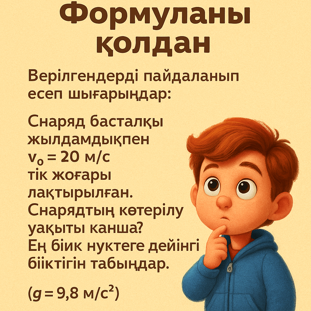 Дискриптор : ЖИ көмегімен берілген тапсырманы орындай алады; Гравитациялық өрістегі снарядтың қозғалысын біледі; Көкжиекке бұрыш жасай және вертикаль лақтырылған дененің қозғалысы кезіндегі физикалық шамалардың өзгерісін сипаттай алады;