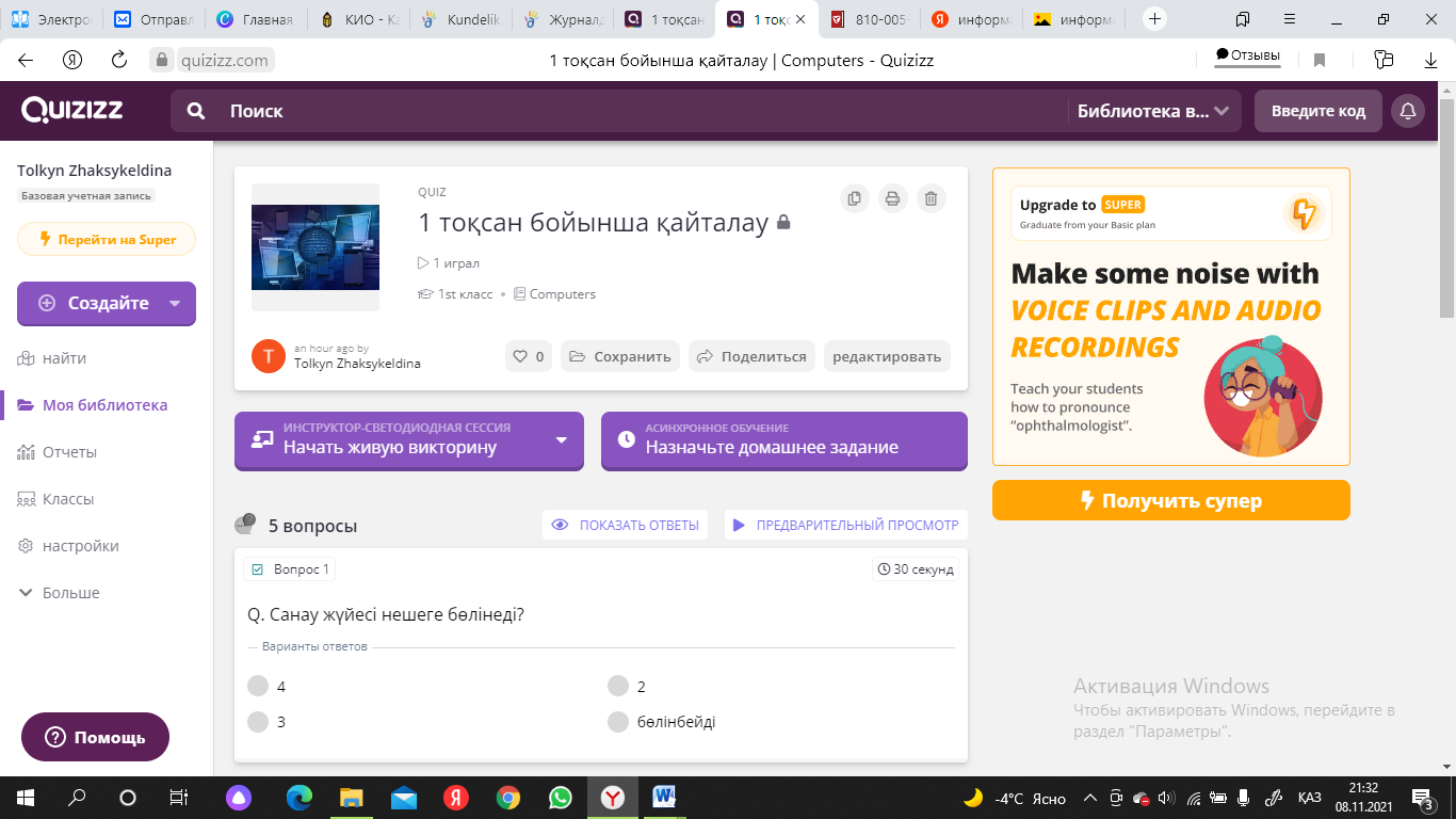 Мұғалім оқушылармен амандасады, сабаққа дайындығын қадағалайды, оқушыларды іскелік ырғаққа бейімдейді. Мұғалім: Сәлеметсіздер ме оқушылар! Біз бүгінгі сабағымызды бастаймыз. 1-тоқсан тақырыптарын қайталау мақсатында Quizizz платформасында тест ұсынылады.