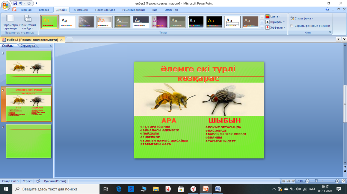 Ендеше, шыбын сияқты босқа ұшып жүрмей, ара сияқты еңбек етіп, пайдалы болып, жемісін көрейік. Бүгінгі сабақта адамның өміріндегі еңбектің рөлі, адам еңбек ету үшін бойында қандай қасиеттер болу керек, «еңбекқорлық», «еңбексүйгіштік» және еңбектің нәтижесіне қалай жетеміз және осы өмірде еңбекқорлық қасиеті, еңбексүйгіштік қасиеті арман-мақсаттарымызға, алдыға қойған тілектеріміздің орындалуына қалай ықпал етеді, сол туралы мәселелерді қарастырамыз. Енді баршамызға аян барлық адам бақытты, жақсы өмір сүргісі келеді. Қалай ойлайсыздар адамдар жақсы, бақытты өмірге қалай қол жеткізеді? Итальяндық ғалым, суретші Леонардо да Винчидің «Көп еңбек еткенге бақыт басын иеді» деген екен. Еңбектің пайдасы – тәрбиелейді, жігерлендіреді, күш береді, қуантады, бақытты етеді, өмір сүруге үйретеді, үнемшіл болуға үйретеді, ширатады, шынықтырады. 2. Бүгінгі сабағымыздың дәйексөзі: «Адал сол – таза еңбекпен күнін көріп, жаны үшін адамшылық ар сатпайды» деген Шәкәрім Құдайбердиевтің ойы. Осы дәйексөзді қалай түсінесіздер? Бұл – адал еңбек ету, адал өмір сүру деген мағынаны береді. 3. Енді осы дәйексөзімізді тереңірек түсіну үшін Қазақстанның 50 алдыңғы қатарлы бизнесмендерінің қатарына кіретін меценант, халықтың жанашыры, қазақ миллионері Бауыржан Оспанов туралы бейнебаянды тамашалаңыздар. 4. Бейнебаянды қарап болсақ, талқылайық.