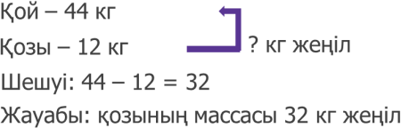 А жиынының элементтері: 30, 50, 40. В жиынының элементтері: 40, 16, 57. А және В жиынына да ортақ элемент – 40 саны, себебі 40 саны А жиынында да, В жиынында да кездеседі. Екінші сурет бойынша: Екі жиынның бірігуі. Жиындардың бірігуі – қандай да бір жиындардың барлық элементтерін қамтитын жиын. Барлық элементтер екі жиынның бірігуінде орналасады. А жиынының элементтері: 30, 50, 40. В жиынының элементтері: 40, 16, 57. А және В жиындарының бірігуінде 30, 50, 40, 16, 57. Ескерту: жиынның бірігуін жазған кезде қайталанатын элементтерді қайталамай, бір рет жазамыз. (40 саны) Үшінші сурет бойынша: Бұл да екі жиынның бірігуі. Барлық элементтер екі жиынның бірігуінде орналасады. А және В жиындарының бірігуінде 30, 50, 40, 16, 57. ә) Жиындардың бірігуі мен қиылысуын салады. «Таулар» жиыны мен «Көлдер» жиынының бірігуіне тиісті элементтер: Қаратау, Зеренді, Мұғалжар, Зайсан, Балқаш. Ескерту: жиынның бірігуін жазған кезде қайталанатын элементтерді қайталамай, бір рет жазамыз. (Зеренді – әрі таудың атауы, әрі көлдің атауы) «Таулар» жиыны мен «Көлдер» жиынының қиылысуына тиісті элементтер: Зеренді. 5–6-тапсырмалар оқушының теңдеу шешу, екі таңбалы сандарды қосу, азайту амалын жетік меңгерту, пысықтау үшін берілген. Үйге берілген 7-тапсырма түсіндіріледі. С – «қосу» сөзіндегі, ал D – «азайту» сөзіндегі әртүрлі |