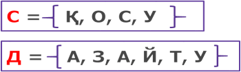 әріптердің жиындары. С және D жиынында неше элемент бар екенін анықтайды. С мен D жиындарының қиылысуы нәтижесінде шыққан жиында неше элемент болатынын табады.