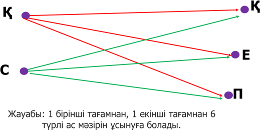 нұсқасын (Қ– Ж; Қ– С; Ж– С; Ж– Қ; С– Қ; С– Ж) көрнекі түрде дәлелдейді. Мақсат қою. Қоршаған ортадағы заттардан «үшүштен» комбинациялар жиынын құруды үйренесің. |