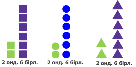 С жиынында 4 элемент бар. (қ, о, с, у) Д жиынында 6 элемент бар (а, з, а, й, т, у) С мен D жиындарының қиылысуы нәтижесінде шыққан жиында 1 элемент бар – (у). 59-сабақ бойынша: 1-тапсырма. А және В жиындарының элементтерін олардың бірігу нәтижесінде шыққан жиынының элементтерімен салыстырады. Не байқадың? А жиынында 4 элемент, В жиынында 3 элемент бар. А және В жиындарының бірігу нәтижесінде шыққан элементтер саны – 6. С мен Е жиындарының элементтерін олардың қиылысуы нәтижесінде шыққан жиынының элементтерімен салыстырады. Не байқадың? С жиынында 4 элемент, Е жиынында 5 элемент бар. С мен Е жиындарының қиылысуы нәтижесінде жиыны құрылды. С жиыны мен Е жиындарының қиылысуы нәтижесінде шыққан жиынның элементтері: көк түсті шаршы, күлгін түсті шаршы. 2-тапсырма. Е және К жиындарының бірігуі және қиылысуы нәтижесінде шыққан жиындардың элементтерін |