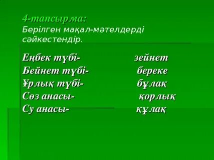 1.Сөздікпен жұмыс. Жаңа сөздермен таныстырады, оқушыларға қайталатады: Оқушыларға қиылған қағаздар беріледі. Сол сөздерді мағынасына қарай біріктіру арқылы топтарға бірігеді. (Оқушылардың ойлау белсенділігі ескеріледі.) Әрбір мақал-мәтелдің тақырыбы және олардың бір-бірімен байланысы слайд арқылы көрсетіледі. Тыңдалым. 1- тапсырма Тыңда. Сұрақтарға жауап бер.
