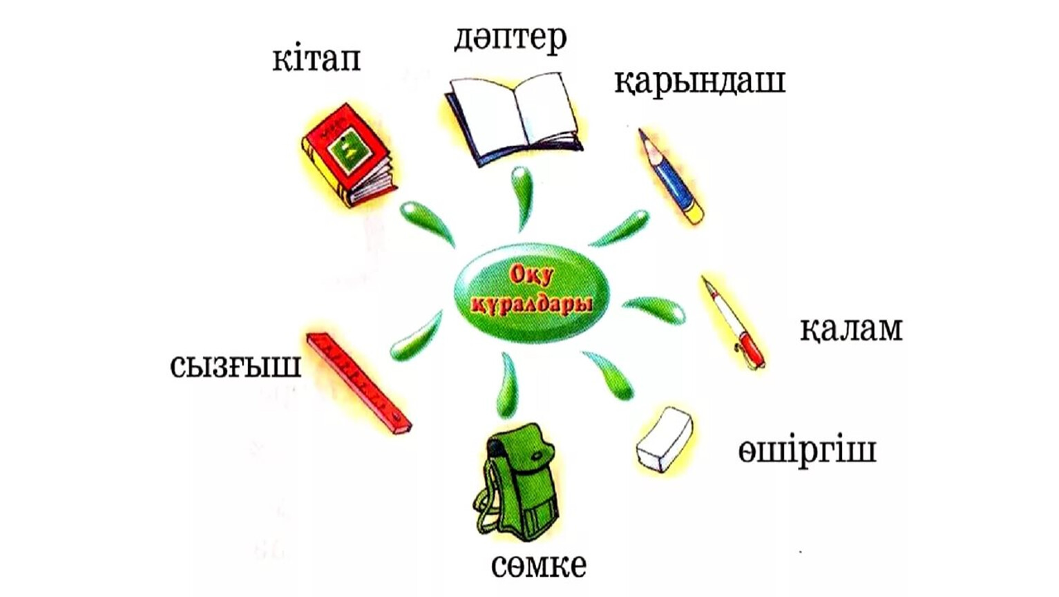 Жазылым Осыдан кейін мектепте кездесетін жабдықтар яғни суреттер таратылып беріледі. Мысалы: орындық, үстел, тақта, терезе, мектеп, асхана, кітапхана, спортзал. Оқушылар суреттің атауын атап буынға бөліп айтады және сол сөзге сөйлем құрайды. 1– топ (асхана, сынып, терезе) 2 – топ (спортзал, орындық, үстел) 3 – топ (тақта, мектеп, кітапхана) Айтылым Сабақты қорыту: Оқу құралдарына байланысты жұмбақ шешу. Шешуін жылдам әрі дұрыс тапқан оқушы медальмен марапатталады. Жұмбақтар Жұқа тақтай бөлшегi, Ұзындықтың өлшемi. (Сызғыш) Оқушыға күнде ерiп, Жүретiн не? (Күнделiк) |