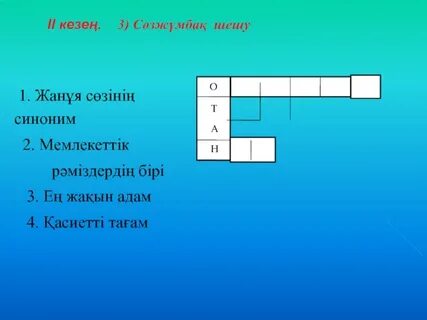 1.Сөздікпен жұмыс. Жаңа сөздермен таныстырады, оқушыларға қайталатады: Оқушыларға қиылған қағаздар беріледі. Сол сөздерді мағынасына қарай біріктіру арқылы топтарға бірігеді. (Оқушылардың ойлау белсенділігі ескеріледі.) Әрбір мақал-мәтелдің тақырыбы және олардың бір-бірімен байланысы слайд арқылы көрсетіледі. Айтыалым. тапсырма Айтылым. тапсырма Сергіту сәті Айтылым Оқушы қажеттіктеріне қарай қолдау көрсетіп, қосымша түсіндіреді ЕББҚ (Зейін тапшылығы және гипербелсенділік синдромы (ЗТГС) жеке қолдау көрсетіледі Жазылым тапсырма. Қосымша тапсырма Жазылым Берілген сөздерден сөйлем құрастыру. Кім дұрыс әрі тез құраса, сол жеңімпаз атанады. |